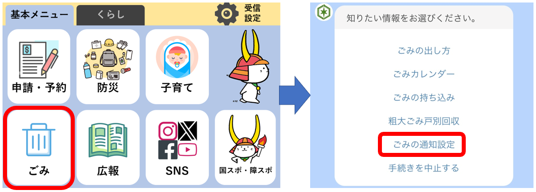 「ごみの通知設定」・・・ごみ等の収集日を通知することができます。