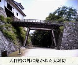 彦根城には、本丸にいたる前後に構築された大堀切(おおほりぎり)があります。大堀切は、彦根山の尾根を断ち切るように構築された大きな空掘です。彦根城の正面である大手門と表門からの敵に対しては、両者が合流する天秤櫓(てんびんやぐら)の外側に大きな堀切が築かれています。現在は橋が架かっていますが、この橋がなければ天秤櫓の高い石垣を登らないと本丸方面へ侵入できません。同様に搦め手(からめて:裏手)からの敵に対しては、西の丸の三重櫓の外に大堀切があって侵入を阻んでいます。