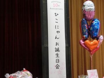 今日はひこにゃんのお誕生日です。彦根城天守前広場でファンクラブの会長とともにケーキやお花をプレゼントしました。またファンクラブが「ひこにゃんのお誕生日会」を開催してくださいましたので、出席させていただきました