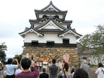 普段は入場できない夜の彦根城を見学できる「彦根城夜楽」の開催日でしたので、ひこにゃんファンクラブの集いに参加くださったみなさんとともに、ひこにゃんに会いに天守に行きました。