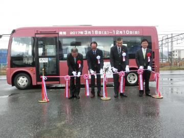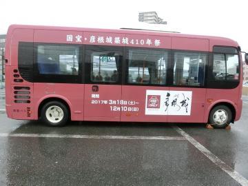 国宝彦根城築城410年祭をPRするため、湖国バスが運行する路線バスにラッピングを施しました。小雨の降る中の出発式には、ひこにゃんも駆けつけてくれました。