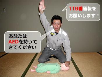 反応ががなければ大きな声で「誰か来てください!」と大きな声で人を集め「あなたは119番に連絡してください!」「あなたはAEDを持ってきてください」と具体的に指示する。