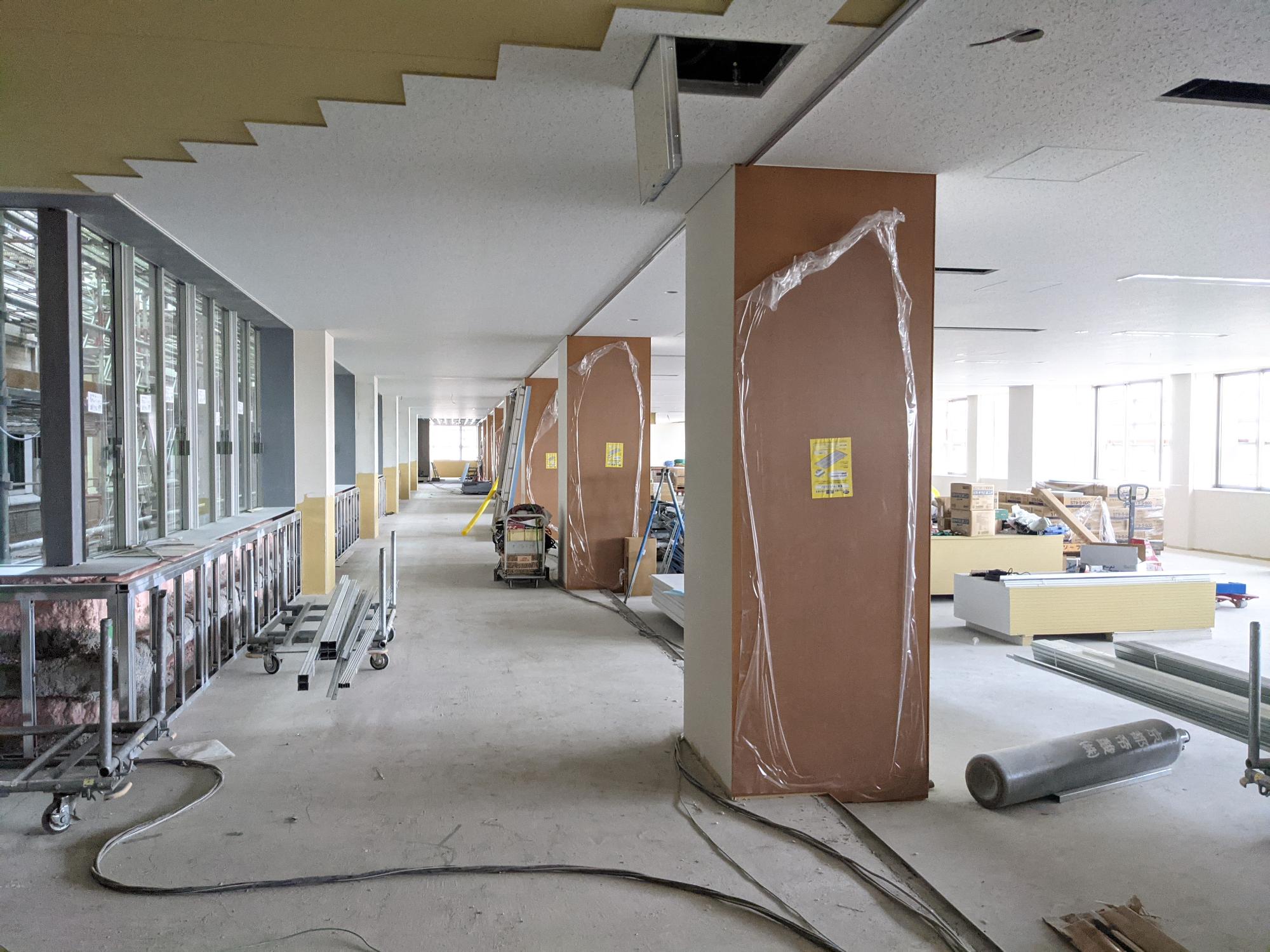 また、既存棟は外部壁および内部壁などの解体作業のほか、耐震補強工事を並行して進めています。