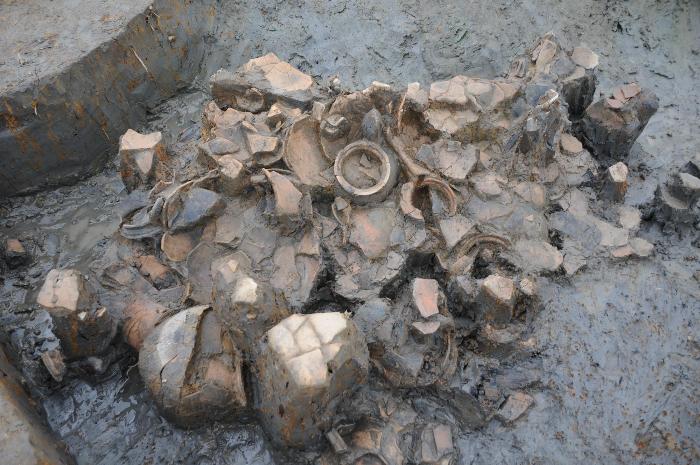 これまでの発掘調査では、文禄川の南岸に居住域があり、主に弥生時代終末から古墳時代初頭の竪穴建物、掘立柱建物、周溝付建物、大溝、方形区画溝、柱列、井戸などを確認しています。出土品としては、土器、石器、木製品、石器、銅鏃などがあります。土器では、外来系土器の数は少なく、大和、山陰、北陸、東海などからの搬入品あるいは模倣品が含まれます。手工業生産関連では、青銅器鋳造・鍛冶に関連する遺構・遺物、製作途中の木製品が出土しています。2019年には矢を入れる武具である靫(ゆき)が導水施設とみられる溝から出土し、重要遺物として注目されます。