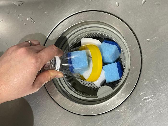 三角コーナーの中にあるごみを、ペットボトルで作成した水切り器で押さえつけている画像