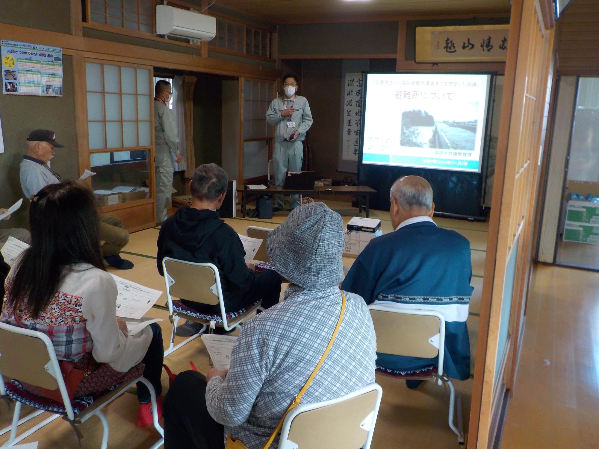 地蔵町公会堂への避難後、危機管理課による「避難情報と避難について」と社会福祉課による「福祉避難所について」を講習しました。避難の取組で必要な情報収集の方法や、避難のタイミングや避難所生活について改めて確認いただく機会となりました。