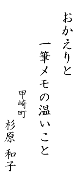 誰が誰にと言わなくとも一読明解。優しさのこもった心温まる句である。日々の生活にこんな心遣いが必要なことを教えられる。当たり前のことをさらりと表現した作品は読者を惹き付け、いつまでも心に残る。