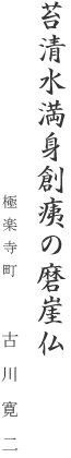 世塵にまみれた娑婆の風にあたれば仏でも滅びる。高松塚の壁画も亦然り。満身創痍が面白い。硬質の漢字多用が岩石のレリーフを引き立てた。賽銭をぬらすのは苔清水。