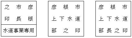| 彦根市長印 | 1 | 正方形 | 21 | 楷書 | 市長名をもってする公文書 | 上下水道総務課長 |