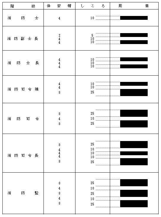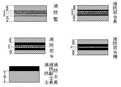 | 周章 | 男性については、帽の腰のまわりには、黒色のななこ織を巻き、消防司令以上の場合には、じゃ腹組金線およびじゃ腹組黒色線を、消防司令補の場合には、じゃ腹組黒色線を巻くものとする。