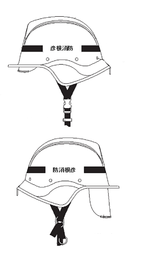 あごひもの両端は帽の両側において金色金属製消防章各1個でとめる。