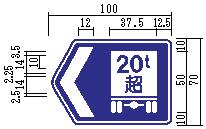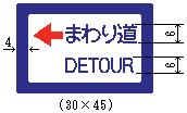 (ア) 案内標識 縁は、待避所(116の5)、駐車場(117-A)およびまわり道(120-B)を表示するものについては9ミリメ-トル、総重量限度緩和指定道路(118の4-A)および(118の4-B)ならびに高さ限度緩和指定道路(118の5-A)および(118の5-B)を表示するものについては16ミリメ-トル、登坂車線(117の3-A)を表示するものについては10ミリメ-トル、道路の通称名(119-A)、(119-B)および(119-C)を表示するものについては8ミリメ-トル、その他のものについては日本字の大きさの20分の1以上の太さとし、縁線および区分線は、日本字の大きさの20分の1以上の太さとする。