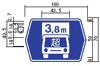 ウ 駐車場(117-A)、総重量限度緩和指定道路(118の4-A)および(118の4-B)、高さ限度緩和指定道路(118の5-A)および(118の5-B)ならびにまわり道(120-A)を表示する案内標識ならびに警戒標識については、道路の形状または交通の状況により特別の必要がある場合にあっては、図示の寸法(イの規定により図示の横寸法を拡大する場合にあっては、当該拡大後の図示の寸法)の1.3倍、1.6倍または2倍に、それぞれ拡大することができる。