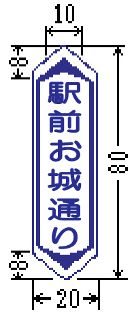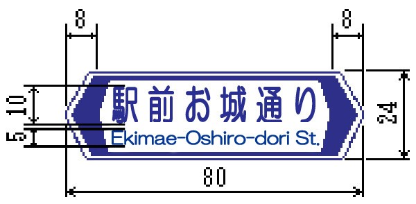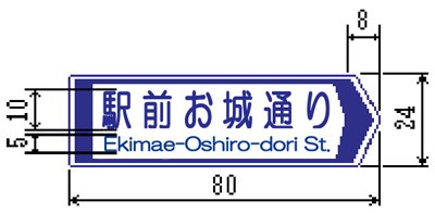 オ 市町村(101)、方面、方向および距離(105-A)、(105-B)および(105-C)、方面および距離(106-A)、方面および方向の予告(108-A)および(108-B)、方面および方向(108の2-A)および(108の2-B)、方面、方向および道路の通称名の予告(108の3)、方面、方向および道路の通称名(108の4)ならびに著名地点(114-A)、(114-B)および(114-C)を表示する案内標識に、それぞれ市章および公共施設等の形状等を表す記号を表示する場合の当該記号の大きさは、日本字の大きさの1.7倍以下の大きさとする。