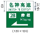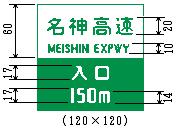 イ 入口の方向(103-A)、入口の予告(104)、方面、方向および道路の通称名の予告(108の3)、方面、方向および道路の通称名(108の4)、著名地点(114-B)、非常電話(116の4)、待避所(116の5)、非常駐車帯(116の6)、駐車場(117-A)、登坂車線(117の3-A)、総重量限度緩和指定道路(118の4-A)および(118の4-B)、高さ限度緩和指定道路(118の5-A)および(118の5-B)、道路の通称名(119-A)、(119-B)および(119-C)ならびにまわり道(120-A)および(120-B)を表示する案内標識以外の案内標識の文字の大きさは、道路の設計速度に応じ、次の表の右欄に掲げる値(ロ-マ字にあっては、その2分の1の値)を基準とする。ただし、必要がある場合にあっては、これを1.5倍、2倍、2.5倍または3倍に、それぞれ拡大することができる。