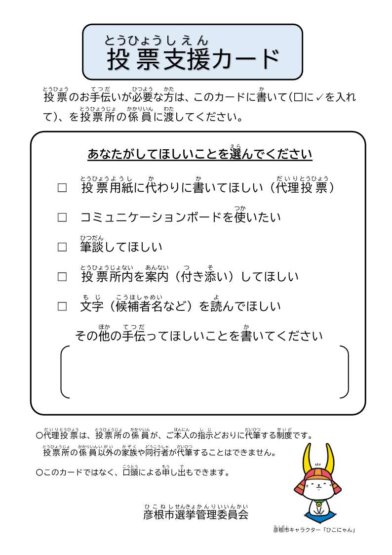 投票支援カードは、彦根市内の投票所や期日前投票所で、代理投票(心身の故障、その他の事由により、自ら候補者の氏名を記載することができない場合)や、投票のお手伝いが必要な方が、係員に口頭で伝えていただくことが難しい場合などにご使用いただくためのものです。